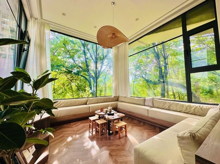 小雨中民宿是一个集住宿、餐饮、亲子休闲于一体的高端民宿,四周树木环绕,葱茏耸翠。走进民宿一层,三面大落地窗映入眼帘,使您感受青山环抱的惬意和畅然,夜晚透过天幕可以看到满载星辉的银河,仿佛在星空中遨游。二层配有游戏机、麻将桌、KTV、大屏投影等娱乐设施,成人儿童尽情玩乐。读书区与窗外景色有效融合,在超大玻璃天幕与窗外树林的结合下,体验书香满林间的至高感受.
